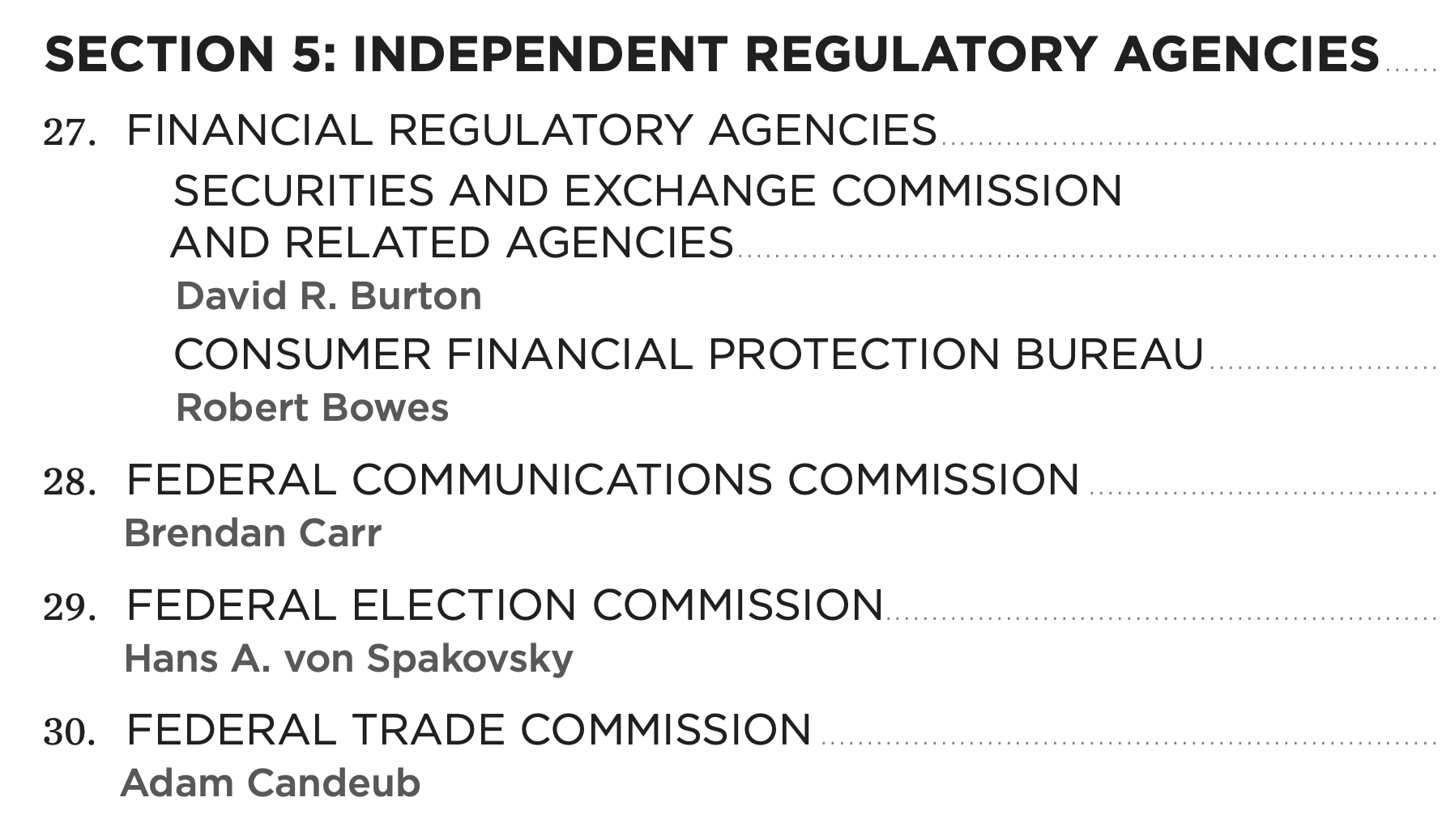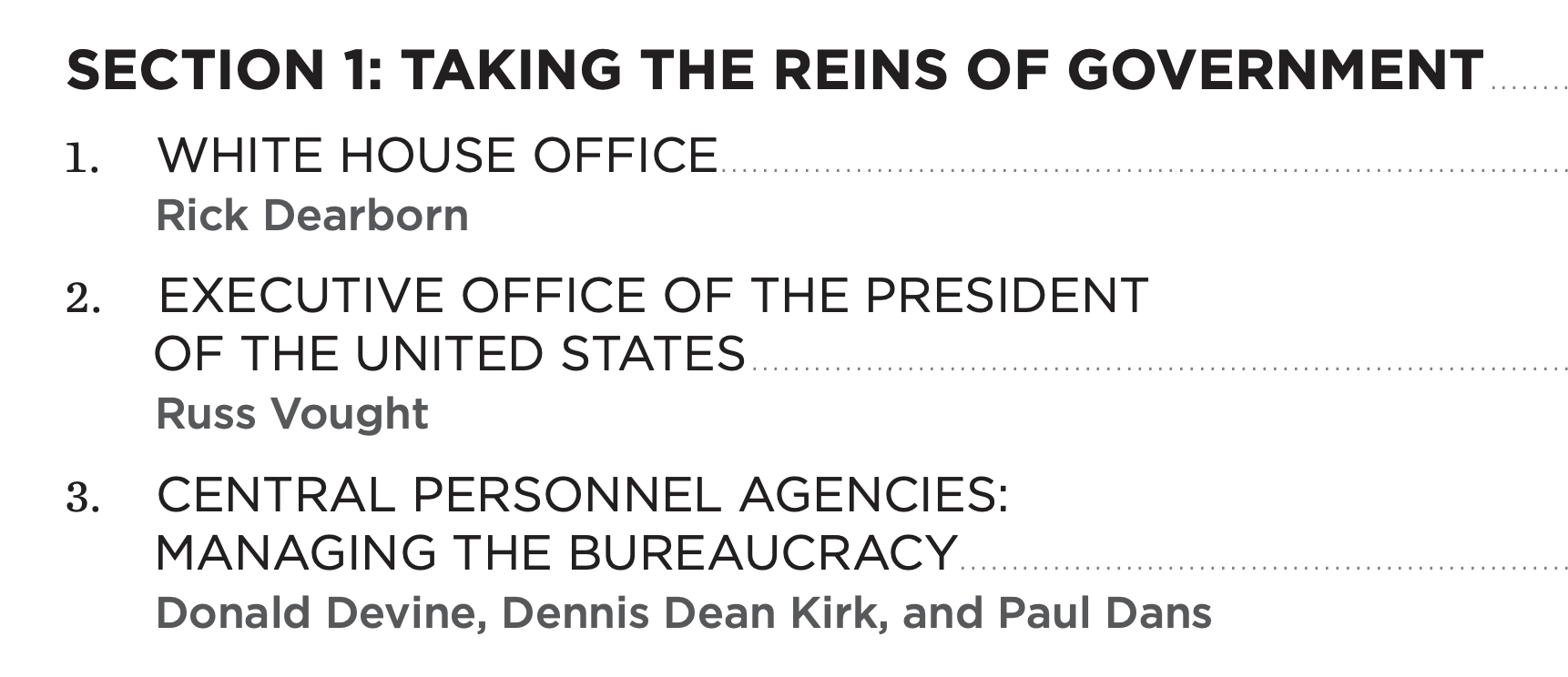 Vought is the author of Chapter Two of the Project 2025 mandate on the Executive Office of the President of the United States. He argues that all power in the executive branch resides only in the president. He denigrates the notion of ‘expert independence’ of career civil servants and agency heads. He calls for the “boldness to bend or break the bureaucracy to the presidential will.”